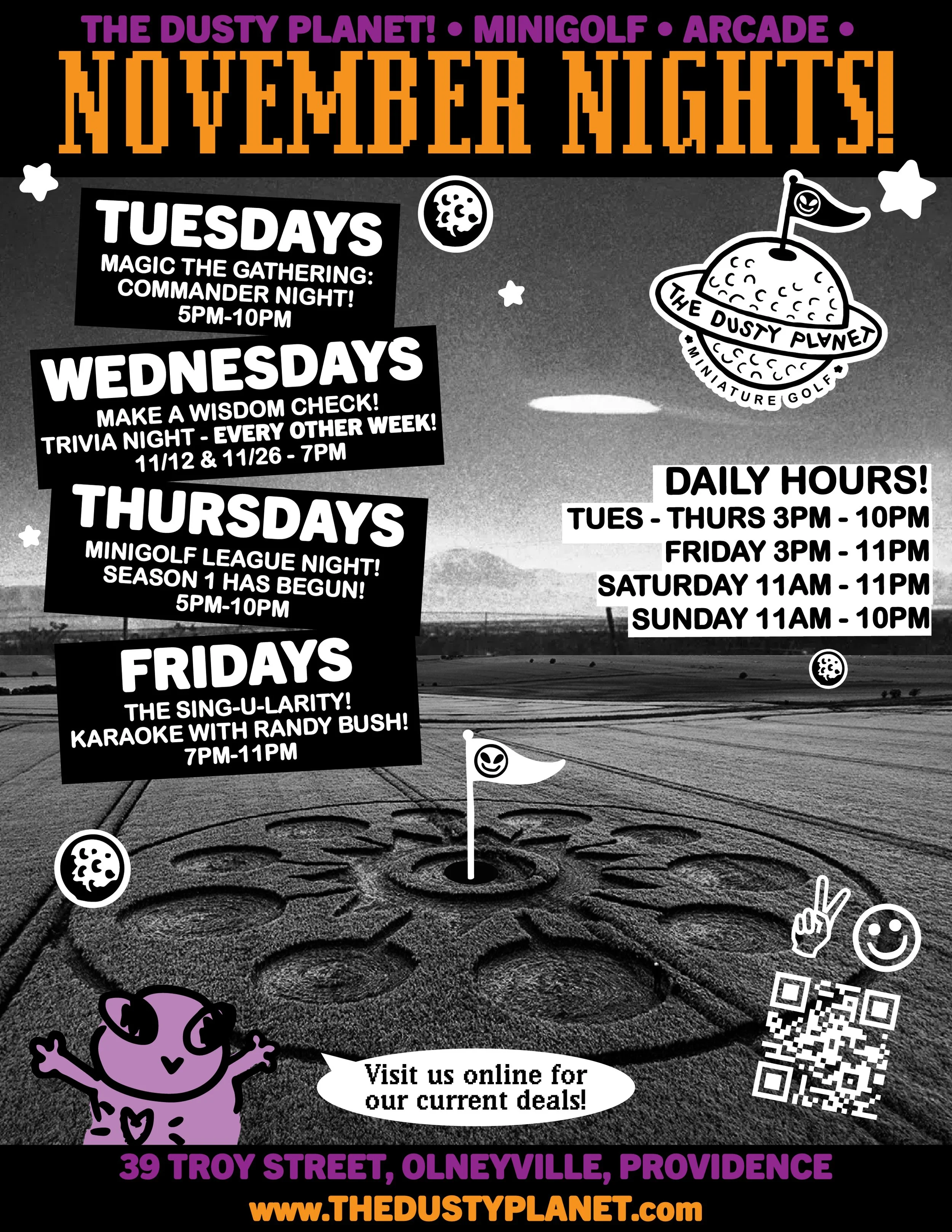 Every Friday The Dusty Planet is open late as we attempt to achieve The Sing-U-Larity! Each week is a new theme with clues for a Secret Trivia Tune! Guess and sing the tune to achieve Sing-U-Larity and win Dusty prizes!